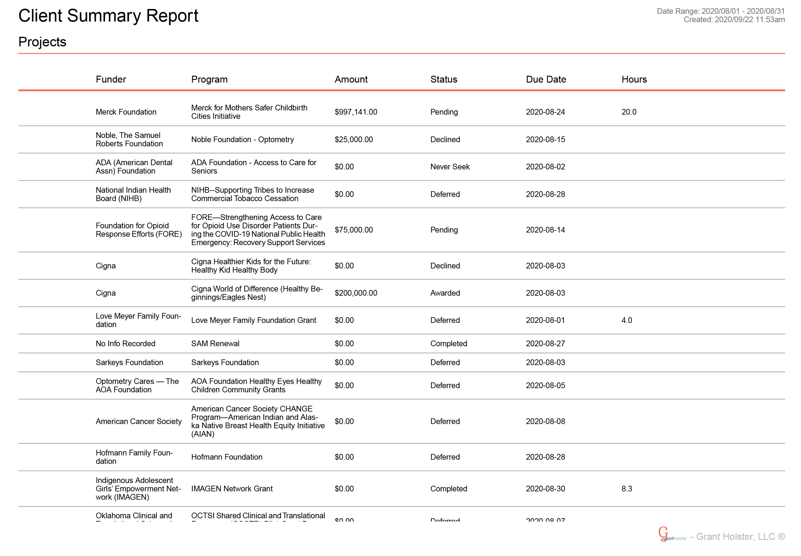 The Client Summary Report is a snapshot of all activity for a certain range of dates. This report pulls client Projects (no matter the status) based on the deadline date of the project(s).